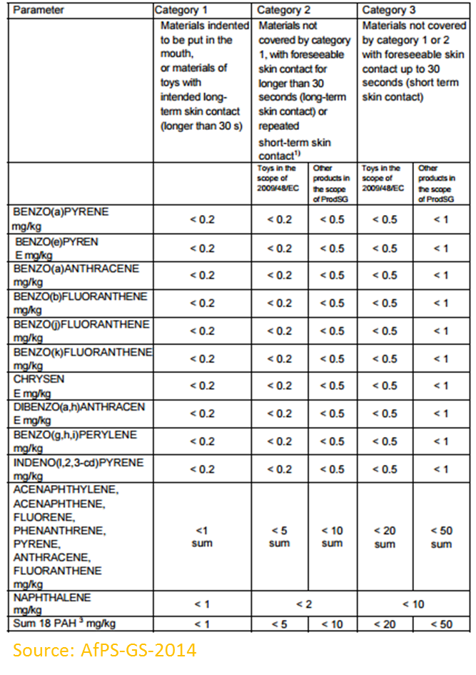 2014年,德國產品安全委員會(AfPS)在AfPS GS 2014:01 PAK的GS標志認證過程中設定了PAH測試的新要求。新標準限制  了物品和消費品中的18種多環芳烴。限制限制可在下表中找到。